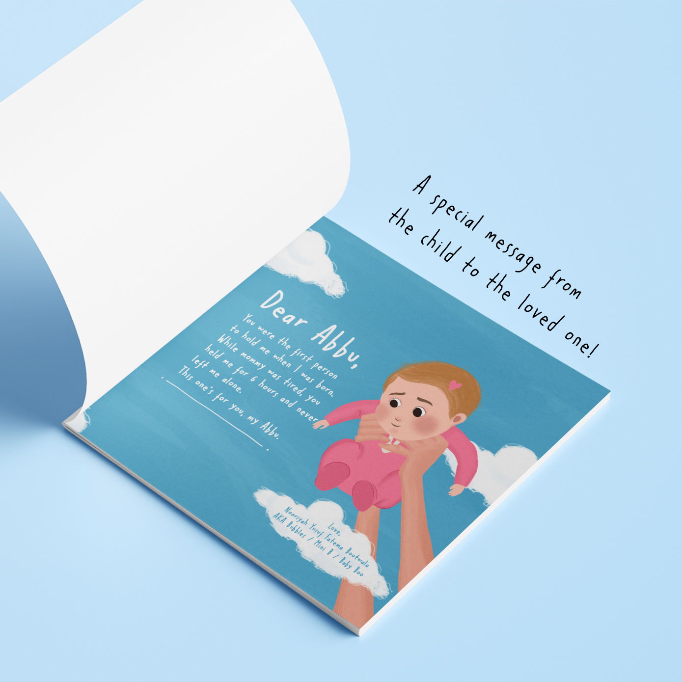 "There's something I want you to know" is a personalised story book which stars your little one along with his/her favourite person in the whole, wide world. The theme is spread across Love & Gratitude for that favourite person. It's a series of adventures and treasured moments between your child and that person.