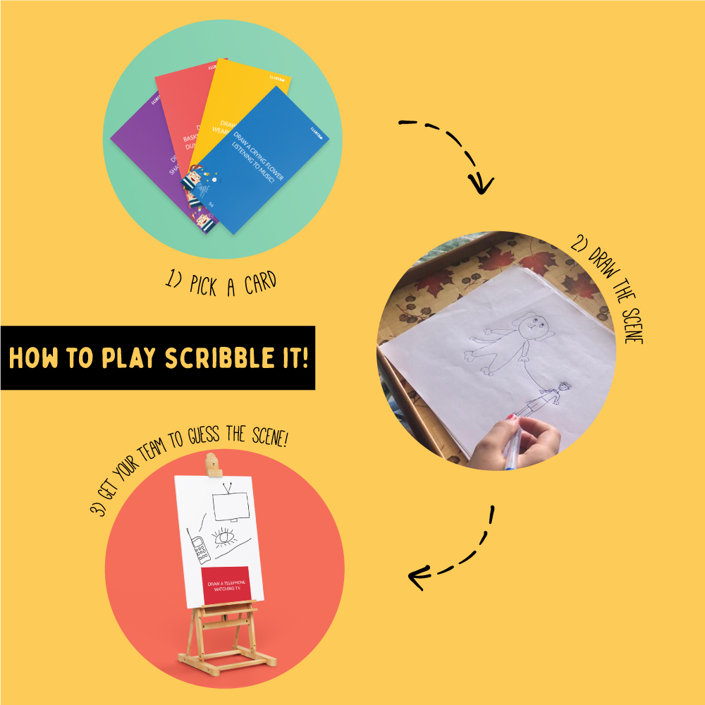 Scribble it! is probably the most hilarious, frantic, fast-paced, family-friendly drawing game! This game is incredibly easy, perfect for kids and adults alike, and guarantees hilarious results! You aren't simply drawing words, you're drawing scenes. And these are some never-seen-before, probably never-seen-again kind of scenes!