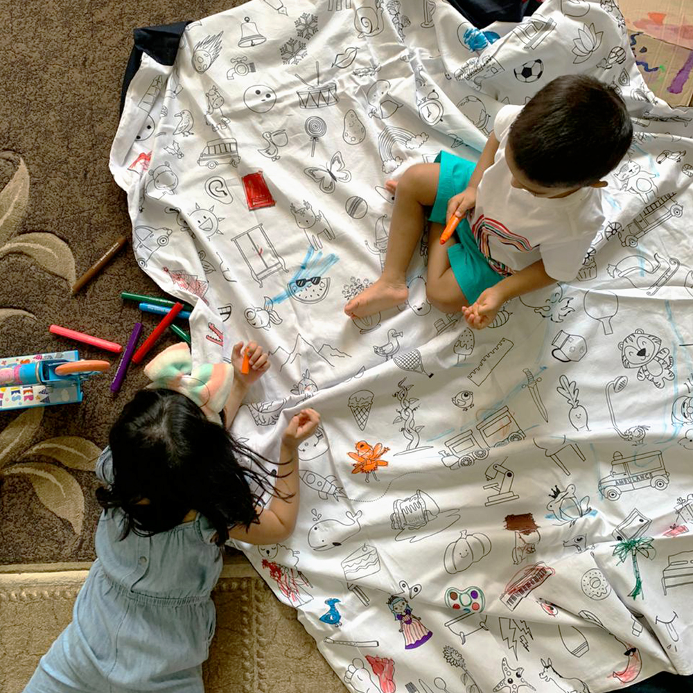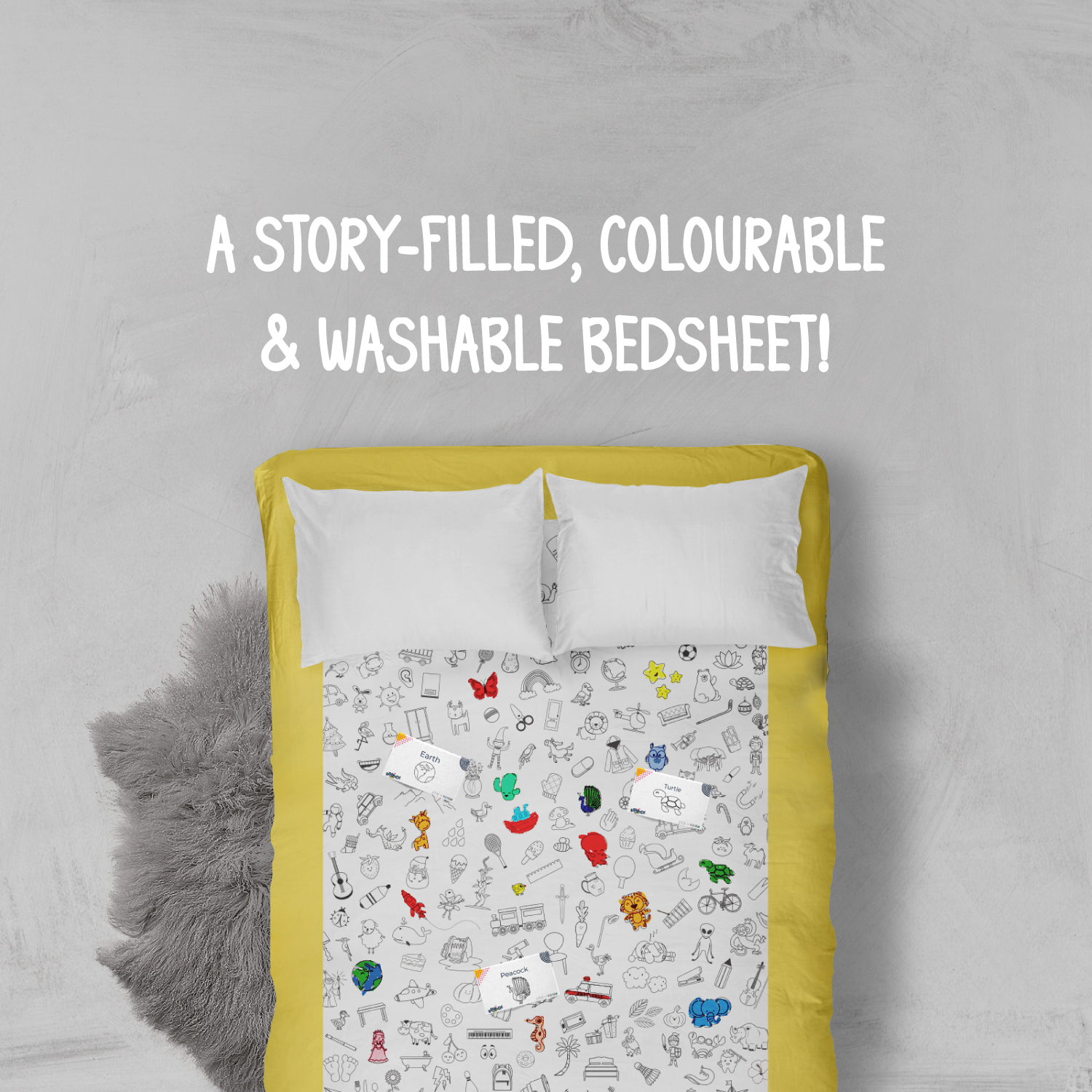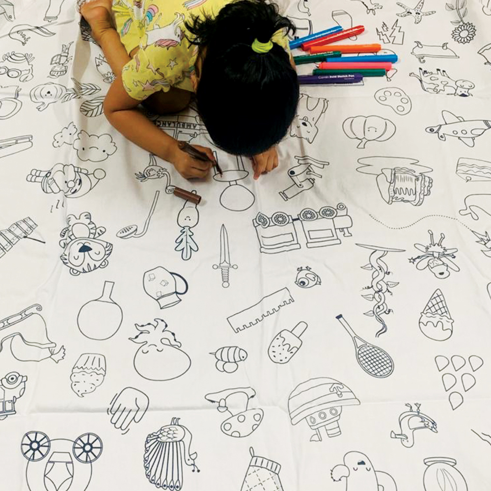 A larger-than-life, colourable, washable, doodle-filled bedsheet to awaken the artist, observer & storyteller in your child!